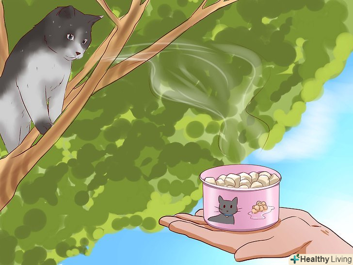 Спробуйте зманити кішку з дерева, використавши їжу або інші стимули. якщо кішка належить вам, запропонуйте їй улюблену їжу. Якщо на дереві знаходиться чужа кішка, використовуйте привабливу для кішок їжу з сильним запахом, наприклад, м'ясо тунця.- Поставте миску з ласощами під деревом і відійдіть в сторону. Якщо кішка не знає вас, вона може побоятися спуститися з дерева, поки ви поруч.