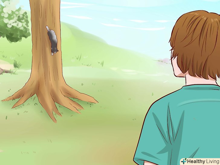 Спробуйте умовити кішку спуститися з дерева, перш ніж робити інші дії. Покличте тварину. Якщо кішка належить не вам, спробуйте розшукати її господаря, щоб він покликав свого вихованця. Кішка охочіше відгукнеться на заклики знайомого їй людини. [3]- Якщо ваша кішка часто застряє на деревах, велику користь може принести дресирування за допомогою клікера. Звуки клікера викликають у тварини потрібну реакцію, і ви можете привчити свою кішку підбігати до вас, коли ви кличете її по імені, клацаючи при цьому клікером. Після такого дресирування ваша кішка, можливо, зможе самостійно спуститися з дерева, подолавши страх і коливання.