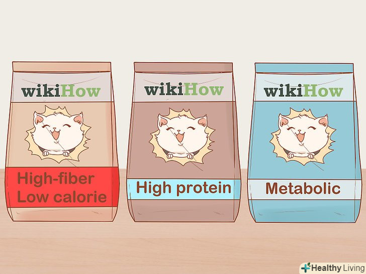 Давайте кішці спеціальний корм. спеціальні корми продаються у ветеринарних магазинах і клініках. Вони дозволяють забезпечити тварину всіма необхідними поживними речовинами і сприяють схудненню. Є кілька типів корму, тому порадьтеся з ветеринаром, який спостерігає ваша тварина.- Існують корми з високим вмістом клітковини і зниженою кількістю калорій . Клітковина допомагає організму насититися. Кішка буде поступово худнути протягом декількох місяців. Прикладами такого корму служить Purina OM (Obesity Management - англ. "контроль ваги") і Hills Rd.