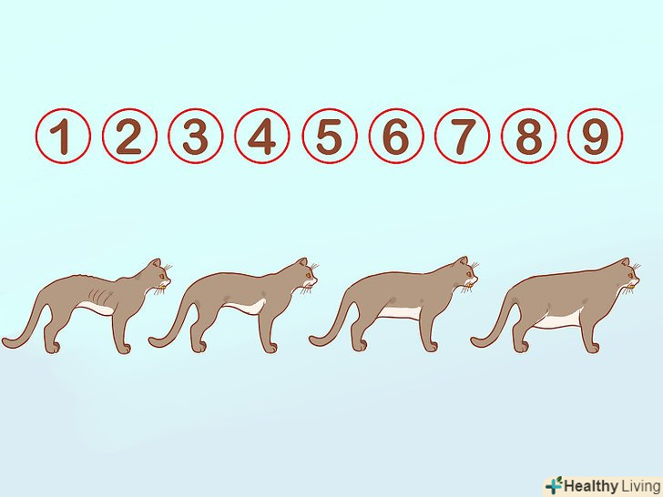Визначте відсоток вмісту жиру в організмі. потреба кішки в калоріях може відрізнятися від рекомендованої виробниками корму. Щоб зрозуміти, худне ваша кішка або поправляється, можна зробити тест. Він дозволить оцінити стан організму і зрозуміти, як багато жиру є на кістках. [17] [18]- Зазвичай в таких тестах використовується шкала від 0 до 5 або від 0 до 10. 0 означає виснаження (кішка голодує), а 5 або 10 - зайва вага. В ідеалі вага кішки повинна знаходитися в середині: 3 за шкалою від 0 до 5 і 5 за шкалою від 0 до 10.