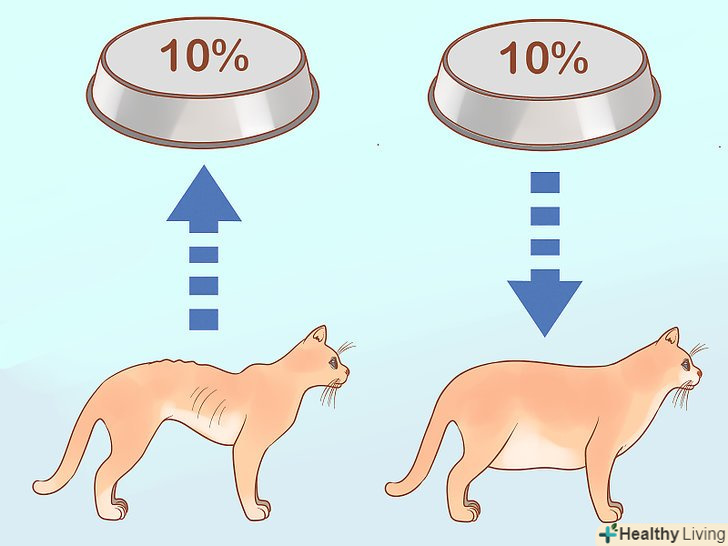 Скорегуйте харчування відповідно до потреб тварини. якщо у кішки зайва вага або вона виснажена, важливо змінити кількість їжі на 10% і через два тижні знову оцінити стан тварини. Після цього корегуйте харчування в залежності від змін.- Не змінюйте харчування різко. У кішок не зовсім звичайний обмін речовин, тому різке скорочення калорій може викликати проблеми з печінкою.