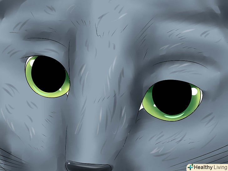 Зверніть увагу на колір очей. очі російської блакитний кішки мають дуже виразний зелений колір. Ця риса починає проявлятися з 4-місячного віку і приймає вигляд зеленого обідка навколо зовнішньої частини райдужної оболонки ока (його кольоровий частини). Всі кошенята народжуються з блакитними очима, але в процесі дорослішання їх колір змінюється на зелений. [4]