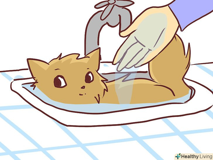 Промийте остаточно шерсть кішки в раковині. перенесіть кішку в іншу частину раковини, зніміть заглушку, щоб злити брудну воду. Підніміть душ, включіть крани від низької до помірної сили струменя. Температура води повинна бути приємно теплою. Мийте водою шерсть, до тих пір, поки вода з кішки не буде чистою.