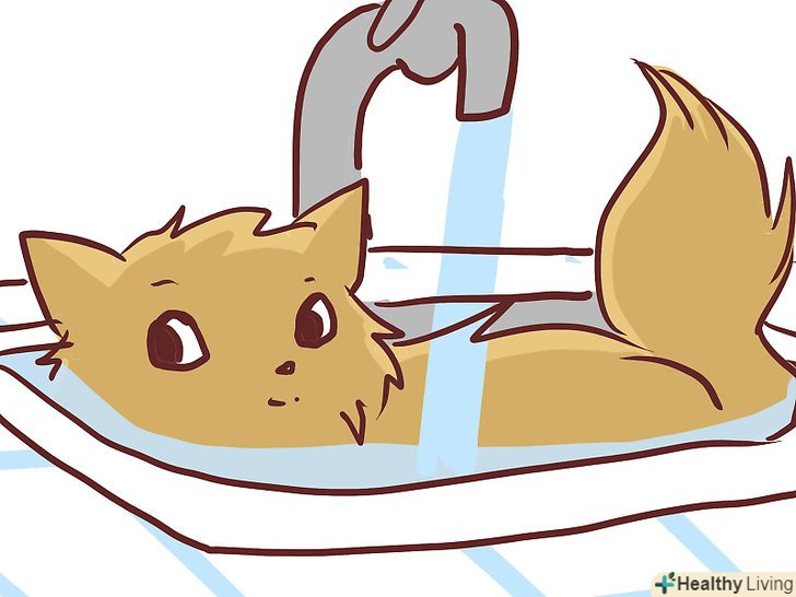Говоріть з кішкою підбадьорливо, як опустіть її в воду. якщо вона впадає в паніку, беріть її за загривок, це може заспокоїти її, так як цей жест, природним чином, підпорядковує кішок. Зберігайте спокій і говорите м'яко весь час, кішка вловлює сигнали від вас, якщо ви будете неспокійні, їй також буде неспокійно. [2]
