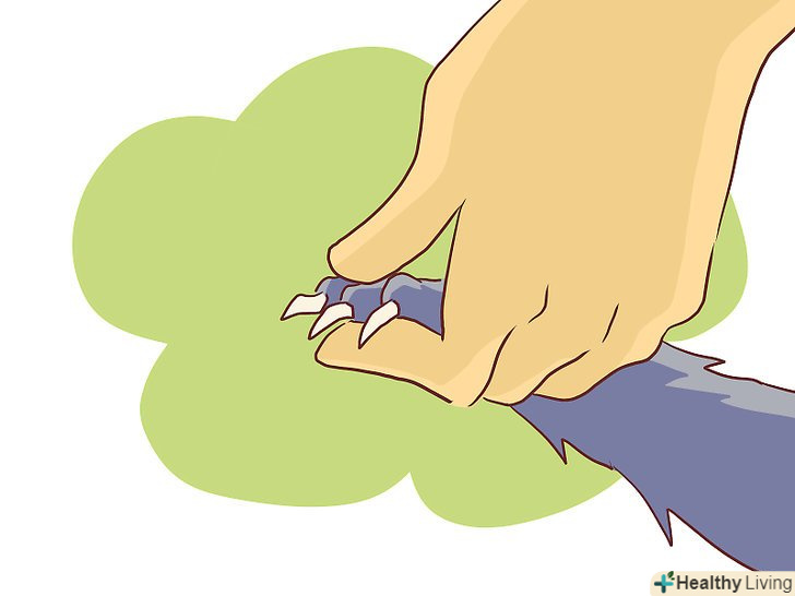 Витягніть кігті кішки, тоді їх легше зрізати. непогана ідея, зрізати кігті, перед початком купання. Ви, звичайно,можете зробити це пізніше. Але в разі стресу під час купання найменш ймовірно, що вона вас подряпає. Щоб витягнути вашої кішці кігті:- Посадіть вашу кішку на коліна, або на робочу поверхню зручної висоти. Підніміть лапу. Щоб витягнути кіготь повністю, м'яко натисніть на останній суглоб пальця-це ефект продовження кігтів.