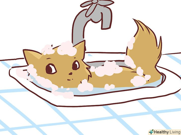 Змийте шампунь з вовни вашої кішки. зачерпніть воду глечиком. Близько тримайте глечик до кішки і виливайте сильним струменем по шкірі і шерсті. Повторюйте кілька разів, поки не буде піни на шерсті кішки. [3]