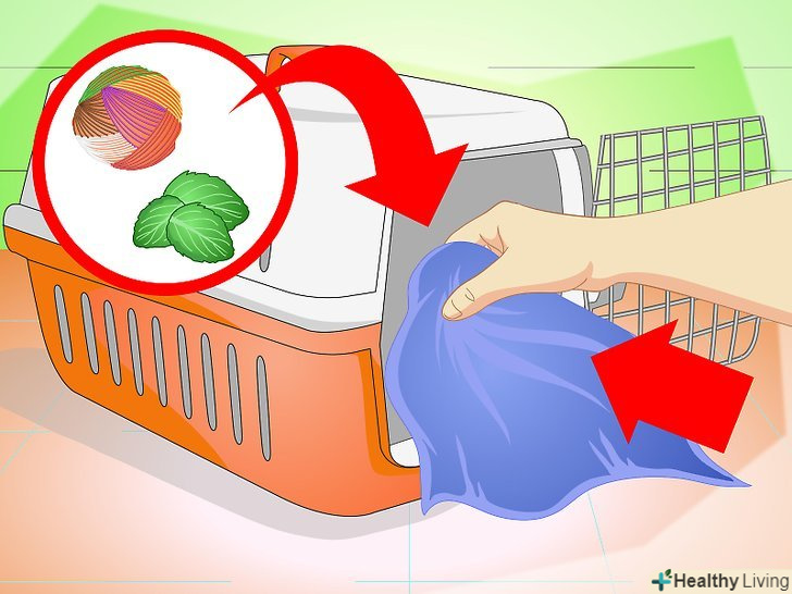 Зробіть перенесення привабливою для свого вихованця. Переноска повинна бути комфортним і безпечним місцем для кішки, навіть якщо вона не в захваті від кошика. [10] Один із способів заманити кішку всередину-використовувати знайомий запах. Наприклад, покладіть всередині улюблений рушник або підстилку вихованця. [11]