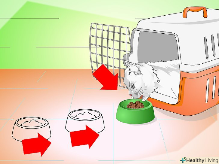 Годуйте кішку в перенесенні. якщо кішка охоче проводить час в кошику, то спробуйте годувати вихованця в той момент, коли він знаходиться в перенесенні. Спочатку кішка напевно відмовиться їсти всередині перенесення і віддасть перевагу ласувати обідом поруч з кошиком. [16]- Розташуйте миску з кормом в півметрі від перенесення і поступово присувайте ближче при кожному годуванні. [17]