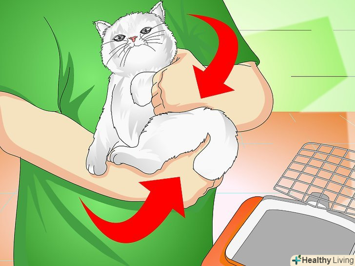 Візьміть кішку в руки. правильний хват впливає на безпеку всього процесу. Однією рукою візьміть кішку під низ, а другий обхопіть навколо грудної клітини. [28] [29] утримуйте задні лапи кішки тією рукою, яка розташовується нижче. [30]- Притисніть спину і таз кішки до своєї грудної клітки і розгорніть животом від себе.