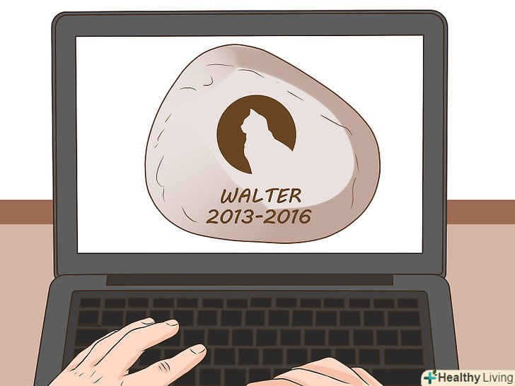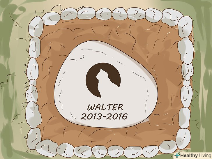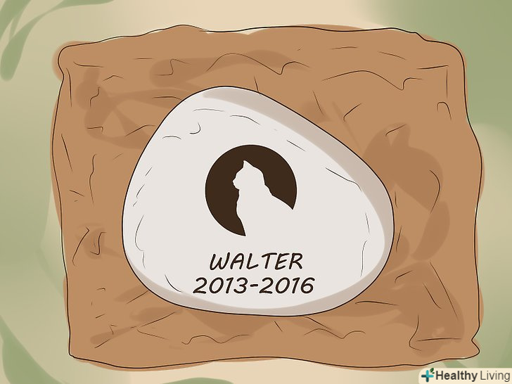 Виберіть надгробний камінь. існують різні способи, за допомогою яких можна виділити могилу вихованця. Наприклад, можна придбати спеціальний надгробний камінь для свого вихованця онлайн. Необхідну інформацію, наприклад, ім'я вашого вихованця, а також дату народження і смерті ви зможете додати самостійно. Однак якщо ви обмежені бюджетом, існують і інші варіанти. [5]- Наприклад, можна зібрати камені у дворі і покласти їх біля могили. Якщо ви хочете, щоб було вказано ім'я вихованця, використовуйте фарбу і напишіть ім'я кішки на найбільшому камені.