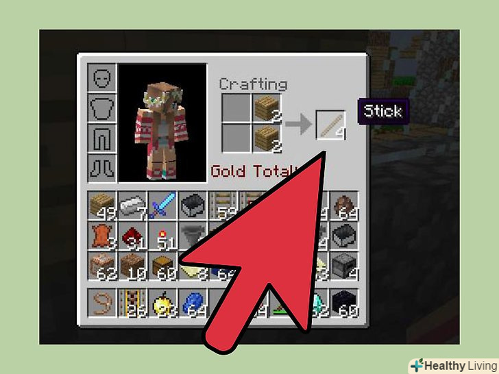 Перетворіть кілька дощок в палиці.якщо потрібно, розбийте ще кілька дерев на деревину, щоб створити з неї більше дощок. Розмістіть одну дошку над іншою в крафтовій області. Перетягніть палиці в свій інвентар.