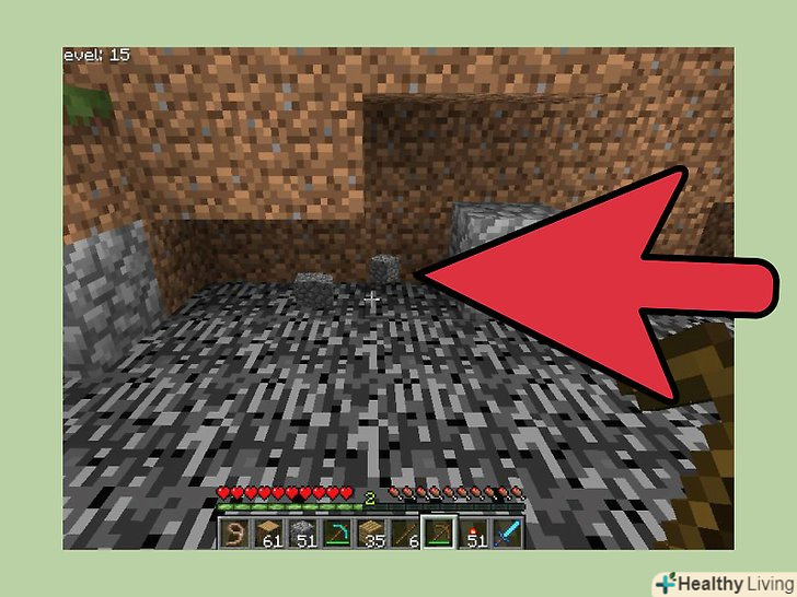 Добудьте бруківки. натисніть га слот швидкого доступу для кирки, щоб взяти її в руки. Знайдіть камінь (сірі блоки) на гірських схилах або прорийте невеликий тунель вниз. Затисніть кнопку удару по кам'яному блоку, щоб розбити його на бруківці.