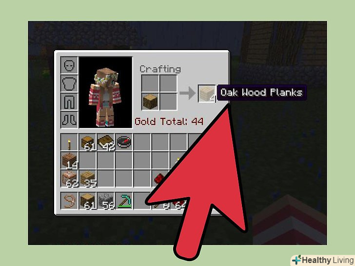 Перетворіть деревину в дошки.відкрийте інвентар і перетягніть деревину в крафтову область. Дошки повинні з'явитися в осередках виведення. Перетягніть дошки в свій інвентар.- Крафтова область представлена у вигляді сітки 2x2 поруч із зображенням вашого персонажа.