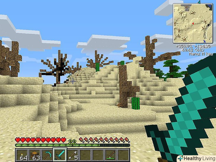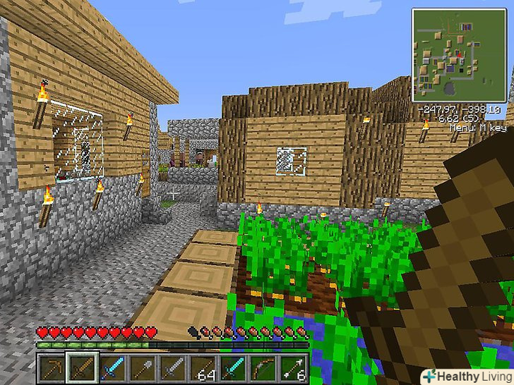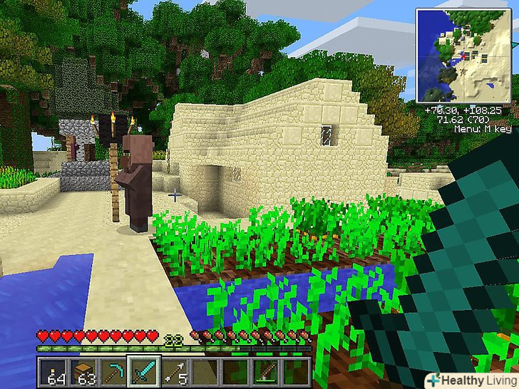 Знайдіть свої координати в грі.коли ви повернетеся в гру, Знайдіть свої координати. Це допоможе вам знайти села. Також можна скористатися командою телепортації і переміститися прямо в село, не обстежуючи для цього ніякі місця.- Якщо ви граєте на комп'ютері, натисніть клавішуF3, щоб дізнатися свої координати. Якщо ж ви граєте в Minecraft PE, щоб дізнатися свої координати, вам доведеться скористатися сторонніми програмами. У версії для консолей свої координати можна побачити на карті. Ви знайдете більше інформації в статті "як визначити координати в Minecraft" .