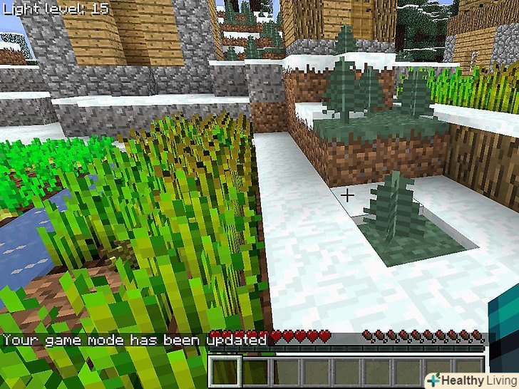 Поверніться в режим виживання.коли знайдете відповідне село, поверніться в режим виживання і продовжите гру.- Версія для комп'ютерів – введіть у вікно чату/gamemode 0, щоб повернутися в режим виживання.