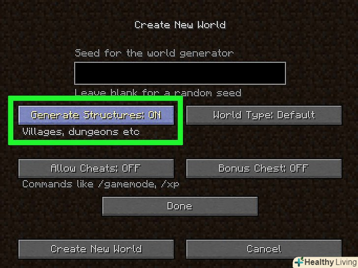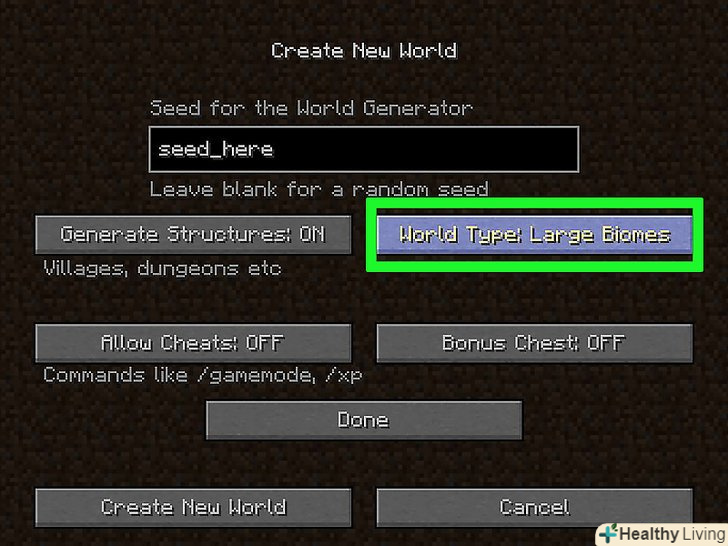 Створюючи новий світ, включіть опцію великих біомів (Large Biomes).якщо ви вирішили створити новий світ у творчому режимі або режимі виживання, включіть опцію «Large Biomes» (Великі біоми), щоб у жителів села було більше місця, де з'явитися. Створюючи новий світ, не забудьте також включити опцію» Generate Structures " (згенерувати будови), інакше жителі не з'являться.