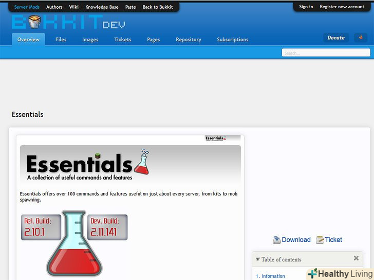 Встановити і налаштувати плагіни Bukkit не так просто.тут ми розглянемо процес установки основних плагінів, які необхідні для запуску багатокористувацького сервера (але не сервера Vanilla). Спочатку встановимо плагін Essentials. Відкрийте нову вкладку у веб-браузері та перейдіть за адресою http://dev.bukkit.org/server-mods/essentials/