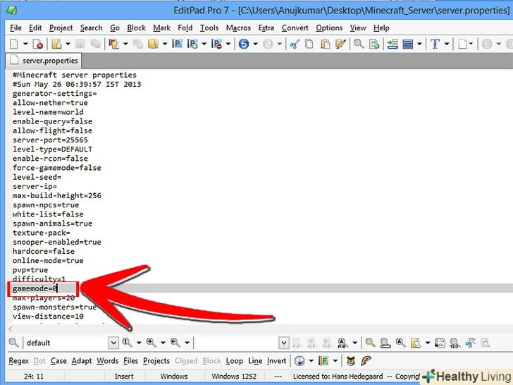 Інший приклад-змініть режим гри, встановлений за замовчуванням. Таким режимом є режим виживання. Змініть значення з "0» на "1", щоб основним режимом став творчий режим.