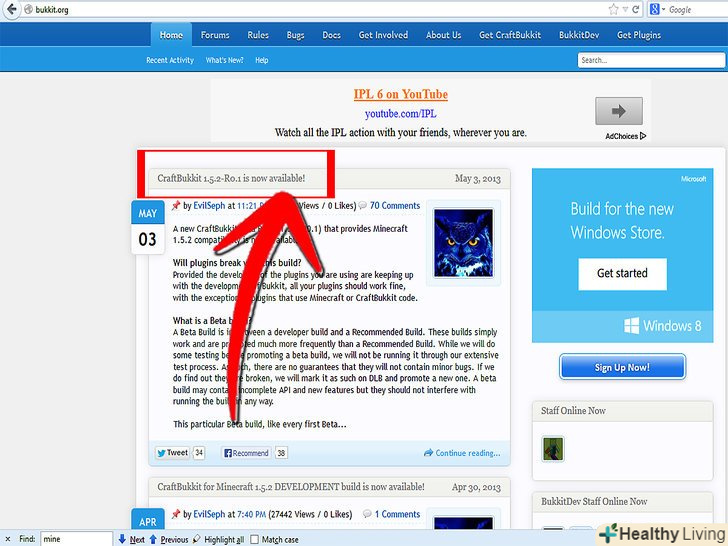 - В іншому випадку скачайте тестову версію Bukkit (не рекомендується для початківців гравців) або встановітьстарішу версію Minecraft, яка відповідає знайденої стабільної версії Bukkit.