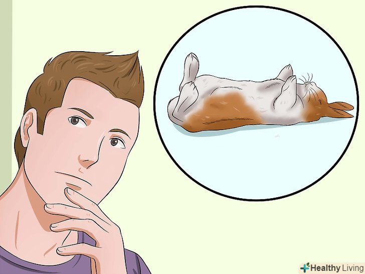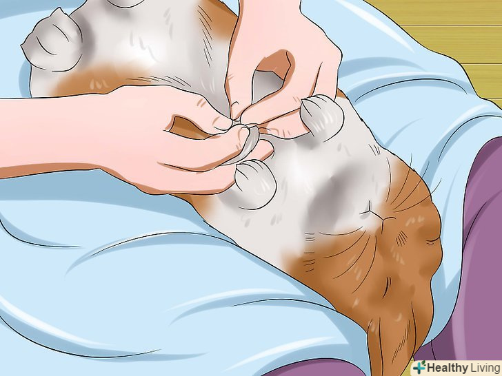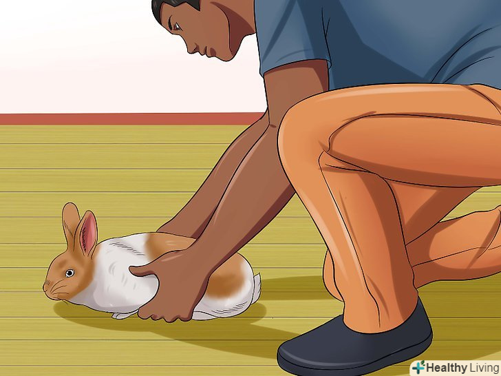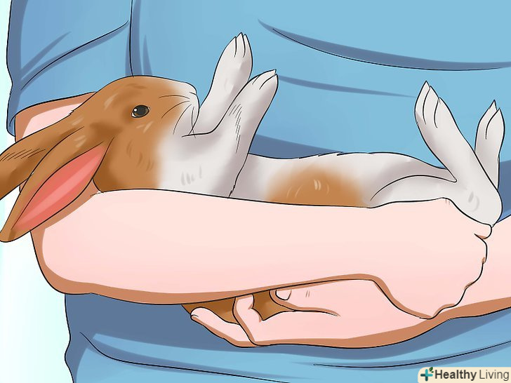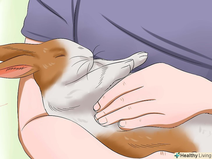 Візьміть кролика і покладіть його на спину. підведіть праву руку під передні лапи кролика, а ліву — під його таз. Підхопите вихованця в колиску з рук (немов дитину). Покладіть кролика спиною на рушник на ваших колінах (зазвичай кроликам не подобається, коли їх перевертають). Простежте за тим, щоб таз кролика виявився вище голови. Кролик буде чинити опір, але зазвичай опір триває недовго. [4]