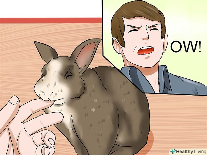 Якщо кролик вкусить вас, видайте особливий звук. якщо кролик спробує вкусити вас, видайте різкий звук. Це дасть кролику зрозуміти, що він заподіює вам біль. Це також відучить кролика робити так (частково тому, що це злякає його). [13]