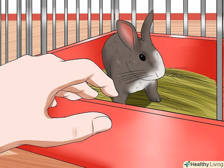 Умовляйте кролика, але не змушуйте його. іноді кролики показують людям, що не хочуть виходити з клітки, притискаючись до задньої стінки. Якщо вам потрібно, щоб кролик вийшов, не витягуйте його. Краще відкрийте клітку і дозвольте йому самому вийти, коли він захоче. Якщо кролик не захоче, покладіть зовні ласощі. Можна навіть покласти ласощі в переноску, щоб кролик міг в неї сховатися. [14]