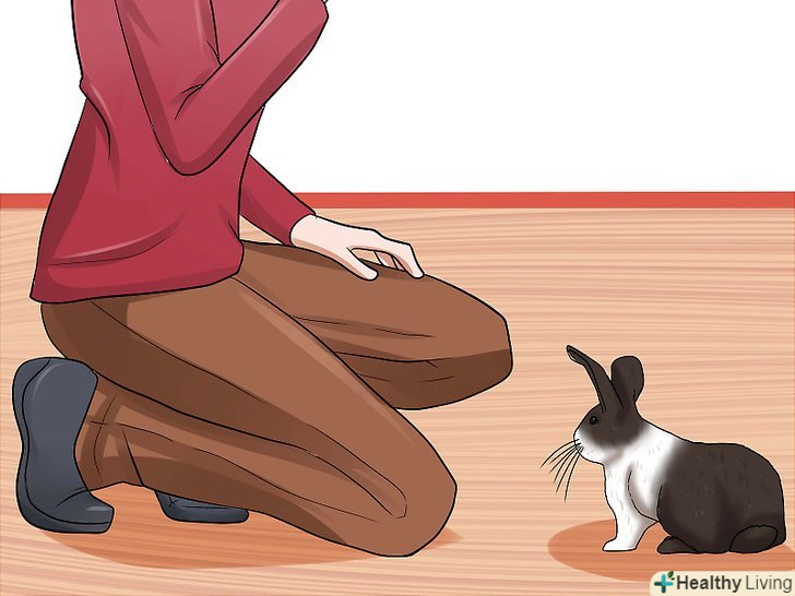 Випускайте кролика в приміщенні, де ви знаходитесь. випустіть кролика в кімнаті, де він не зможе нічого погризти. Сядьте на підлогу і нагніться до Кролика. Дайте кролику вивчити простір навколо вас. Кожен раз, коли кролик буде підходити до вас і обнюхувати, давайте йому ласощі. Так у кролика виникне асоціація з чимось приємним. [5]- Використовуйте ласощі тільки перші кілька разів. Потім почніть давати кролику його звичайну їжу, враховуючи її в денному раціоні.