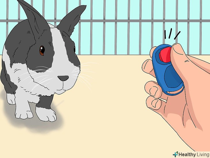 Подумайте про використання в дресируванні клікера. багато людей використовують Клікери для закріплення асоціацій у тварин. [5] кожен раз при частуванні кролика клацайте клікером, щоб він почав асоціювати його звук з частуванням. Потім під час дресирування звук клікера буде говорити кролику про те, що він близький до отримання свого частування.- Постарайтеся клацати клікером відразу ж в момент здійснення правильного дії, щоб тварина розуміла, за що отримує заохочення. Давайте кролику частування або щось ще, що йому подобається, кожен раз протягом декількох секунд з моменту клацання, навіть якщо ви клацнули випадково. Кролик буде знати, що клацання означає Отримання частування, і постарається заробити ці клацання.