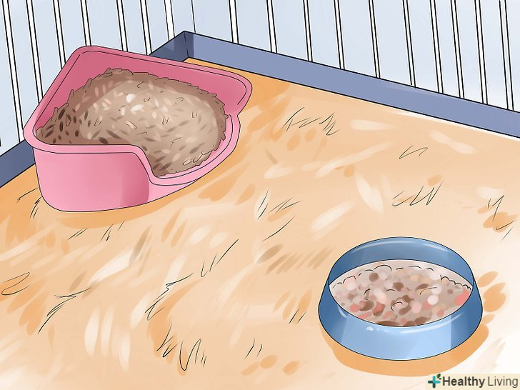 Насипте в клітку шар підстилки і поставте миски. засипте решту території клітини підстилкою, встановіть в протилежному від туалету кінці миски з їжею, водою і укриття. [11] наявність укриття дозволить кролику ховатися і відчувати себе в клітці в безпеці.