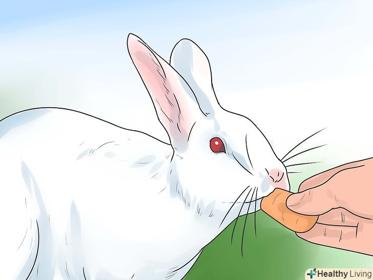 Заохочуйте кролика за використання туалетного лотка. ніколи не кричіть і не зліться на кролика, якщо він не користується туалетним лотком. Кролики від цього не вчаться. Для них набагато кращим учителем служить позитивне заохочення.- Пропонуйте кролику частування, наприклад, шматочок яблука або моркви, відразу ж після використання туалетного лотка. Це буде закріплювати у кролика позитивні асоціації із застосуванням туалетного лотка.