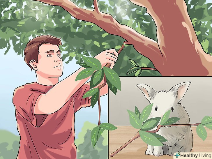 Зріжте для кролика гілку дерева. Кроликам подобається свіжа необроблена деревина. Улюбленим деревом більшості кроликів є яблуня. Якщо у вас є така можливість, зріжте кролику гілку яблуні і дайте йому погризти її в своє задоволення. [13]