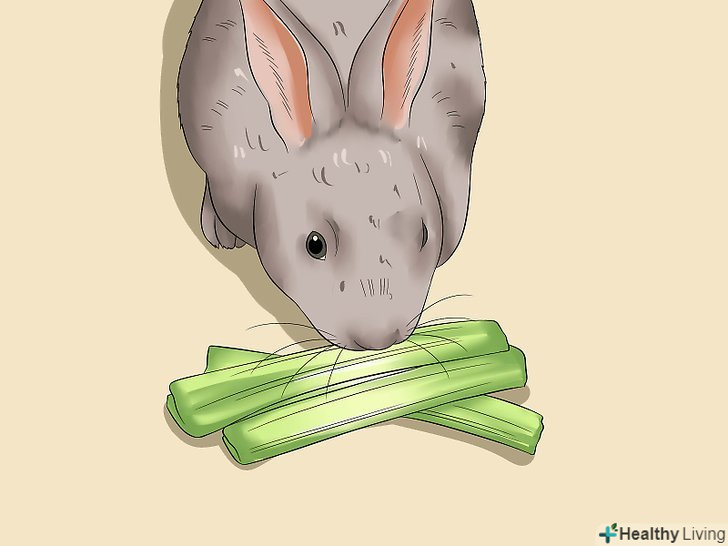 Годуйте кролика свіжими овочами. овочі наситять кишечник вологою, [13] що сприятиме процесу травлення. Кролику можна давати найрізноманітніші овочі, включаючи селеру, листову капусту, зелені перці і листя і стебла редису. [14] Кроликам корисні овочі з великим вмістом вітаміну А: брокколі, морква, листя гірчиці. [15]- Вважається, що овочі можуть викликати у кроликів діарею, однак це зазвичай трапляється тільки в тому випадку, якщо давати кролику багато різних овочів за раз.