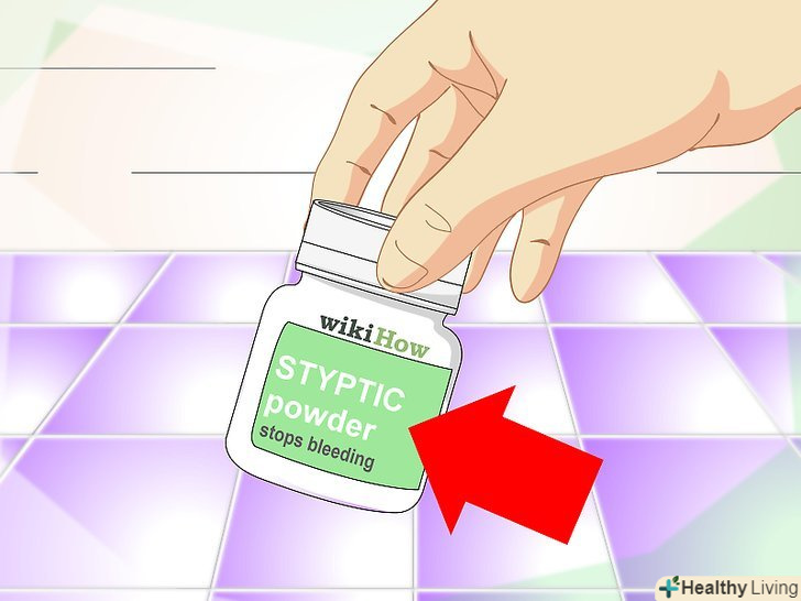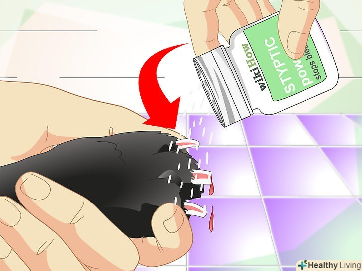 Запасіться кровоспинним засобом на випадок можливої кровотечі. якщо ви ненавмисно обрізаєте кіготь занадто коротко, він почне кровоточити. Біля основи кожного кігтя є жива частина, і якщо її зачепити, кіготь почне кровоточити. Для такого випадку майте при собі терпкий порошок, який допоможе зупинити кровотечу. [3] при кровотечі наберіть щіпку кровоспинного порошку і посипте їм місце надрізу. Якщо у вас немає під рукою такого порошку, замість нього можна використовувати звичайну муку. [4]- Кровоспинний порошок або олівець можна придбати в найближчій аптеці. Кровоспинні олівці дозволяють швидко нанести на ранку в'яжучу речовину, і їх легше знайти в аптеках, ніж кровоспинний порошок.