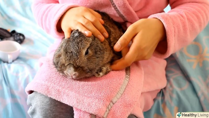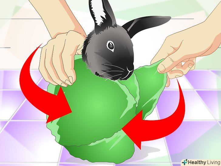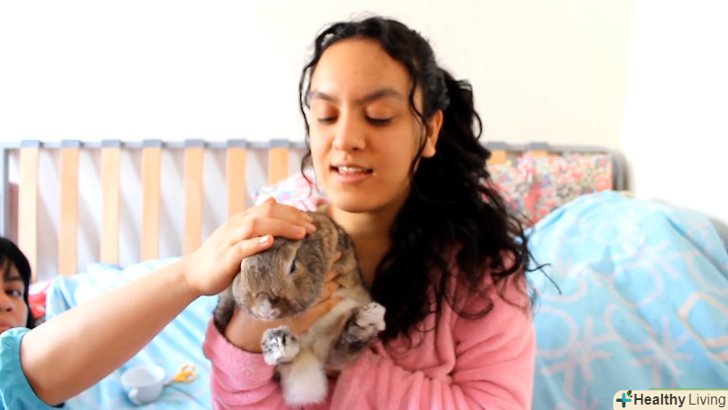 Злегка притисніть кролика до свого тіла. посадіть тварину на край столу і обхопіть рукою, притуливши до себе. Сядьте, щоб вам було зручніше. Обхопіть долонею груди кролика і притулите до себе задню половину його тіла. Слідкуйте за тим, щоб тварині було зручно. Прикладайте невеликий тиск лише в тому випадку, якщо кролик почне вириватися. [6]- Спробуйте заколисати кролика у себе на колінах, як маленьку дитину. Покладіть кролика спиною собі на коліна, помістивши його голову на згин ліктя. Однією рукою візьміть лапку, а інший утримуйте тварину.