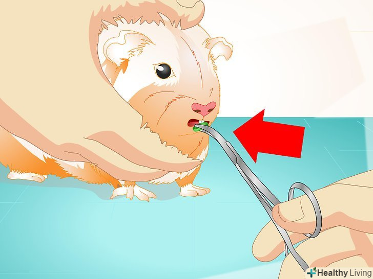 Давайте своєму вихованцеві таблетки за допомогою кровоспинного затиску. при дефіциті вітаміну С морській свинці можуть знадобитися таблетки цього вітаміну. [8] кровоспинний, або гемостатичний затиск використовується для стиснення кровоточивих судин. Такий затиск можна придбати в аптеці, магазині медичних товарів або через Інтернет. Він легко проходить в рот морській свинці і за своїми розмірами і формою добре підходить для того, щоб давати їй таблетки. [9]- Візьміть морську свинку таким же чином, як це робиться для того, щоб дати їй рідке ліки зі шприца. За допомогою кровоспинного затиску просуньте таблетку їй в рот до самих корінних зубів. Простежте, щоб тварина здійснювала жувальні рухи, які свідчать про те, що воно проковтнуло таблетку.