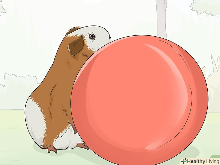 Навчіть морську свинку катати м'ячик. використовуйте для цієї мети такий м'яч, який не буде занадто важким або занадто великим, наприклад, тенісний м'ячик, щоб робота з ним не викликала у морської свинки труднощів. Також вам знадобиться довге і плоске частування для морської свинки, наприклад, смужка морквини. [5]- Покладіть смужку з морквини на підлогу, а потім поставте на неї м'ячик.