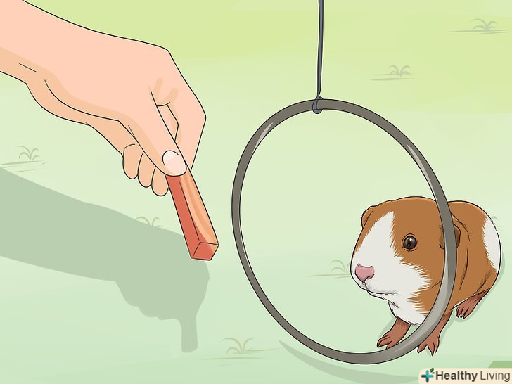 Навчіть морську свинку стрибати через кільце. Вам буде потрібно готове кільце з діаметром близько 15-25 см, або ви можете виготовити його самостійно з дроту. Також можна використовувати спиляний верхній край пластикового контейнера від морозива або тенісну ракетку без волосіні. Обов'язково переконайтеся в тому, що використовується вами кільце або його замінник не має гострих країв і зазубрин, за які морська свинка може зачепитися під час вивчення стрибків. [6]- Почніть з розташування кільця таким чином, щоб воно стосувалося підлоги кімнати або дна клітини морської свинки. Тримайте частування по одну сторону кільця або попросіть кого-небудь допомогти з цим, поки ви тримаєте саме кільце.