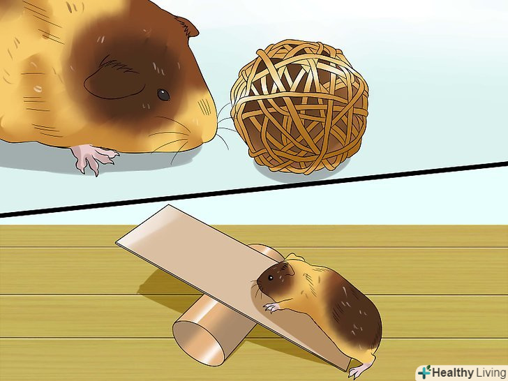 Надайте вихованцеві різноманітні іграшки. іграшки є важливою складовою забезпечення морській свинці щасливого існування. У продажу бувають різні види іграшок для морських свинок, включаючи їстівні іграшки, іграшки, які можна гризти, і іграшкові кульки. Крім того, ви можете самостійно зробити іграшки для морської свинки з картонних трубочок від рулонів туалетного паперу, порожніх взуттєвих коробок і картонних упаковок від молока. [5] незважаючи на те, що ви не будете безпосередньо спілкуватися з морською свинкою, поки вона грає, ніхто вам не забороняє проводити цей час поруч з нею.- Їстівні іграшки та іграшки, які можна гризти зазвичай виготовляють з міцних натуральних матеріалів, наприклад з деревини. Вони не тільки служать розвагою для морської свинки, але також дозволяє їй сточувати постійно зростаючі зуби. Зуби морських свинок здатні ставати небезпечно довгими, тому наявність іграшок для сточування зубів допоможе вашому вихованцеві підтримувати хороший стан здоров'я ротової порожнини. [6]