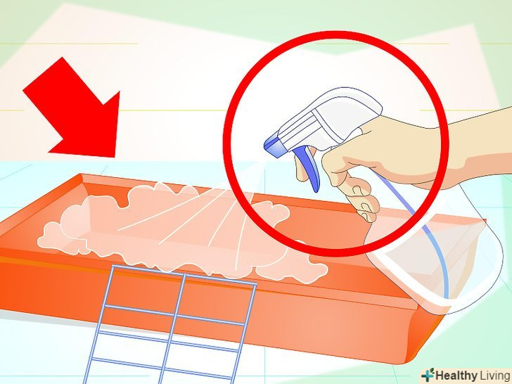 Побризкайте на дно клітки. використовуйте м'який миючий засіб або суміш з трьох частин теплої води і однієї частини дистильованого білого оцту. [12]- Для більш сильних плям і бруду використовуйте нерозбавлений оцет, але потім обов'язково добре його змийте!