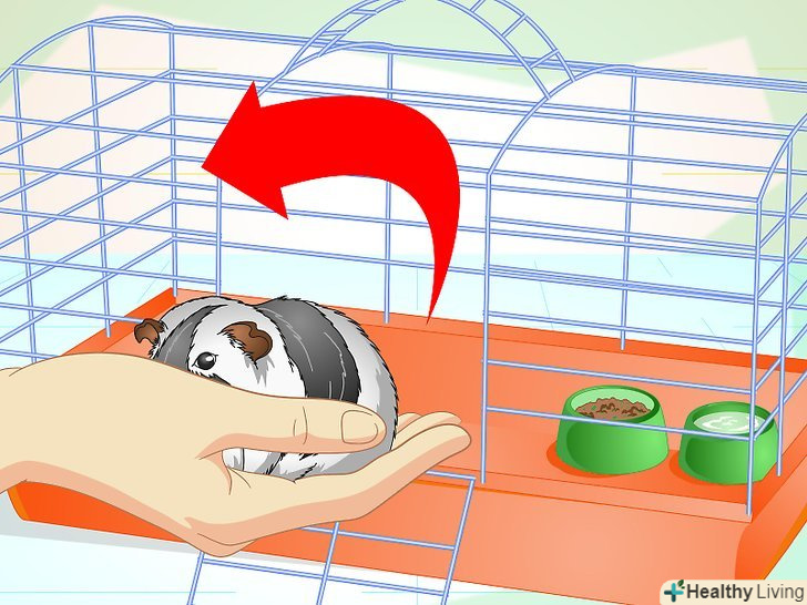 Дістаньте морську свинку з клітки. піймавши морську свинку, посадіть її в безпечне, закрите з усіх боків місце, звідки вона не зможе втекти. Переконайтеся, що ніякі гучні звуки не налякають свинку. Нехай хтось поспостерігає за Вашою свинкою або потримає її на руках.