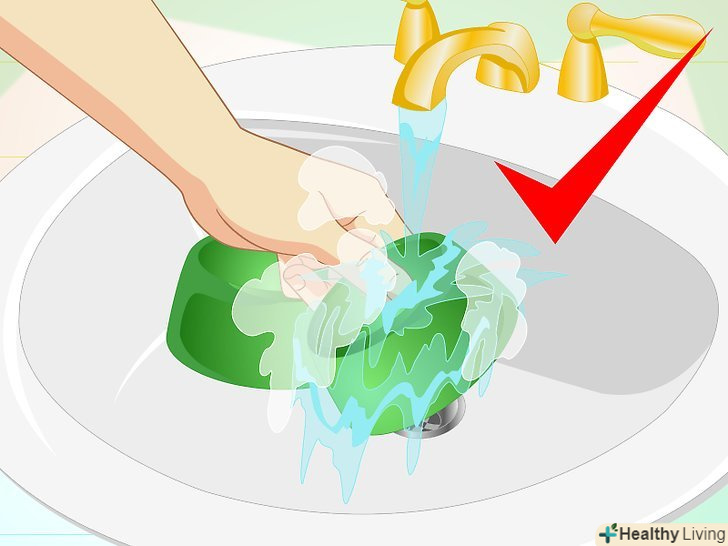 Вимийте мисочки для їжі і води в гарячій мильній воді. роблячи це кожен день, ви зможете запобігти розмноженню бактерій в ємностях для води і їжі. [8]