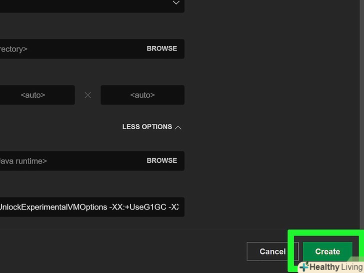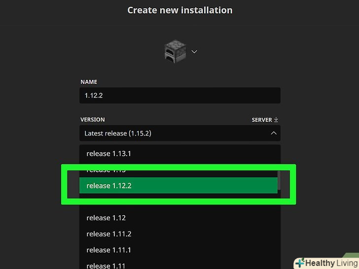 НатиснітьCreate (створити).ця кнопка знаходиться в нижньому правому куті вікна лаунчер. Стара версія Minecraft буде встановлена і додана в список всіх встановлених версій.- Щоб запустити старішу версію Minecraft, натисніть " Play "(Грати) у верхній частині вікна лаунчер — ви повернетеся на головний екран. Тепер в меню, яке знаходиться внизу екрану, виберіть потрібну версію гри, а потім натисніть велику зелену кнопку «Play» (Грати).