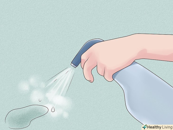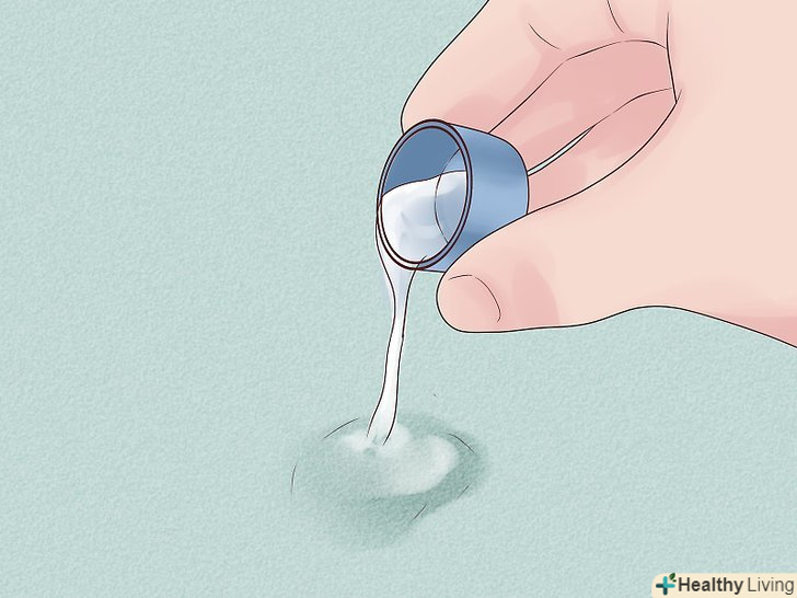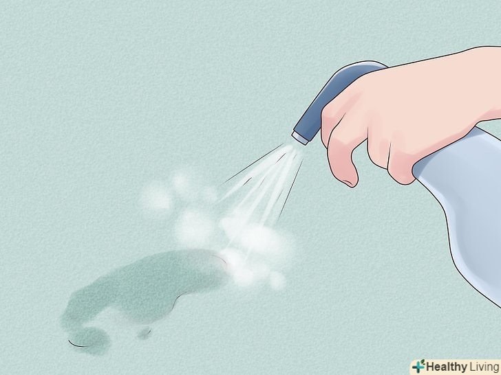 Змішайте перекис водню з рідиною для миття посуду. змішайте 250 мл 3%-ої перекису з 5 мл простої рідини для миття посуду в пульверизаторі. Переконайтеся в тому, що ви взяли 3%-Ву перекис. Більш концентрована перекис може пошкодити килим або покриття підлоги. Ви також повинні перевірити, що рідина для миття посуду не містить в собі відбілюючих компонентів, інакше на килимі можуть залишитися плями. [4]
