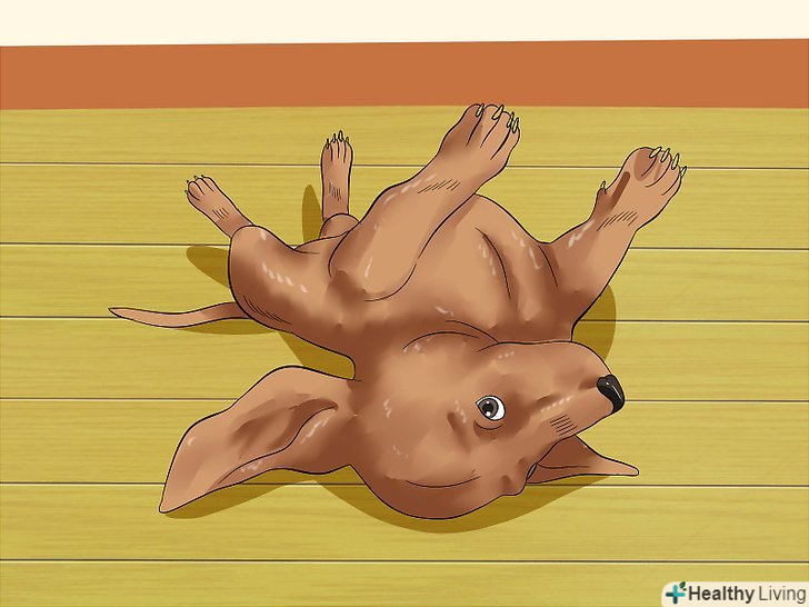 Навчіться інтерпретувати перекочування на спину. коли щеня перекочується на спину, він повідомляє про те, що він або розслаблений, або наляканий і підпорядковується вам. У розслабленому стані тіло вихованця буде розкутим: паща буде відкрита, задні лапи — безсило повислими з боків, а хвіст буде повільно виляти. У разі переляку і підрядної поведінки голова собаки буде відірвана від землі, а паща виявиться закритою. [48]- Піджатий хвіст і одна піднята вгору задня лапа теж говорять про переляк або підпорядкування. [49]