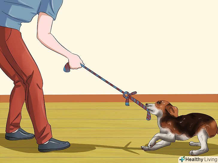 Пограйте з цуценям в перетягування каната. гра в перетягування каната дозволяє наростити фізичну силу собаки і її впевненість в собі. [36] щоб пограти в цю гру, виберіть невелику м'яку іграшку, яку собака без праці може схопити пащею. Граючи з собакою, стежте за тим, щоб під час гри у неї не виникало агресії. [37]- Якщо цуценя починає гарчати, ймовірно, гра вже переростає в агресивну боротьбу.