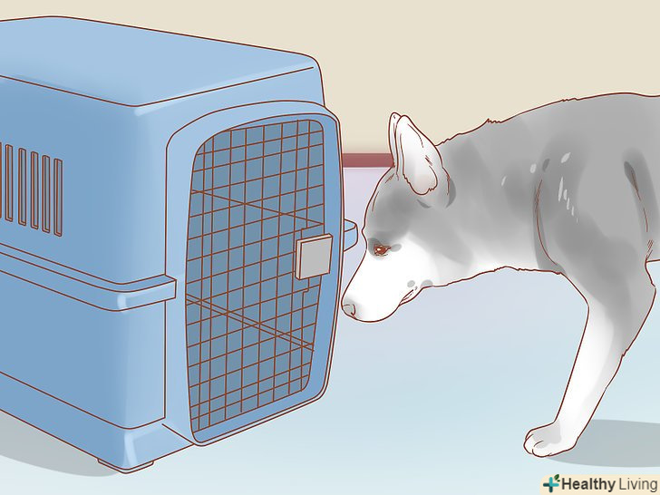 Познайомте собаку з кліткою. ви повинні піднести клітку як щось позитивне. Дайте собаці повністю нюхати її, перш ніж посадити її в машину. Після фіксації клітини всередині автомобіля посадіть в неї собаку. Покажіть, що клітка-це добре, похваліть собаку і відійдіть на кілька хвилин. Можете заманити собаку в клітку за допомогою ласощі, але не заштовхуйте її силою. [2]