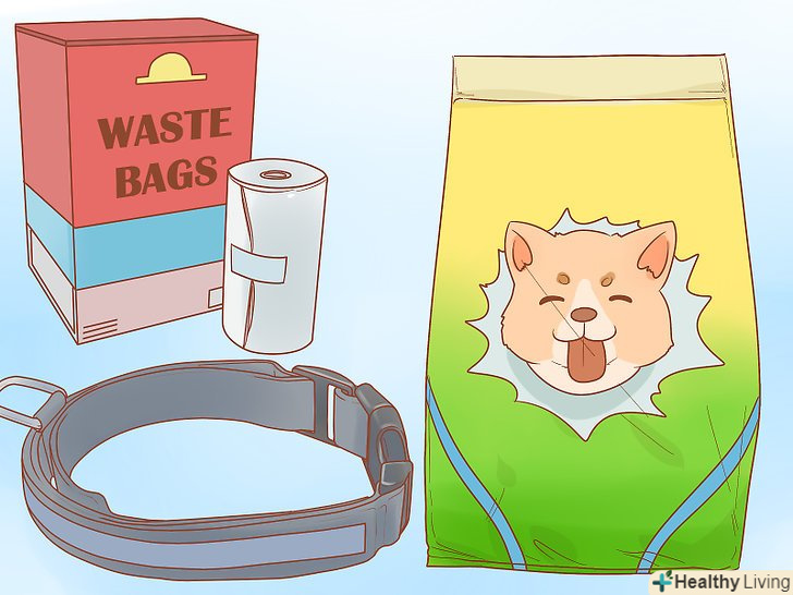 Зберіть всі необхідні речі для собаки. зробіть місце собаки комфортним, постеливши ковдру або лежанку. Також візьміть воду, ліки, нашийник, повідець, кілька улюблених іграшок і пакети для сміття.