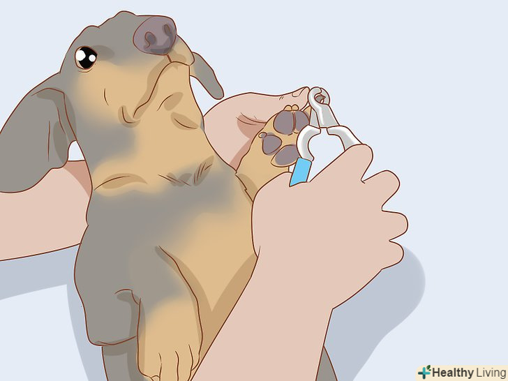 ПідстригайтеСобаці кігті. для підстригання кігтів такси вам буде потрібно спеціальний когтерез для собак. Його можна придбати в зоомагазині. Вам також може знадобитися попередньо привчити таксу до того, що ви будете торкатися до її кігтів, перш ніж ви спробуєте їх стригти. Якщо ваша такса чинить опір вашим дотикам до її лап і кігтів, почніть привчати її з погладжування лап і дотиків до пальців. Хваліть її і пригощайте, коли вона дозволяє вам торкатися до пальців. Після звикання собаки до дотиків до лап ви можете приступати до підстригання кігтів. [13]- Не зрізайте кігті занадто сильно, щоб не поранити їх живу частину. Це дуже болісно і може супроводжуватися кровотечею.
