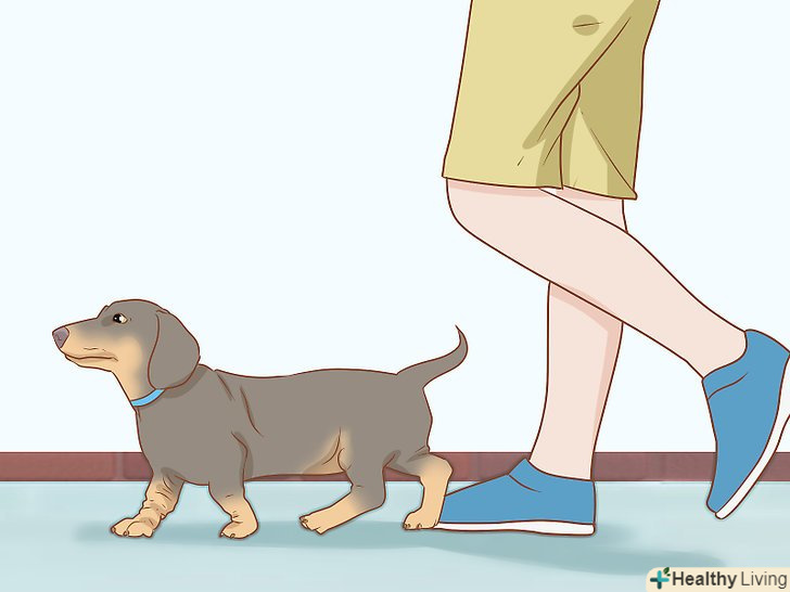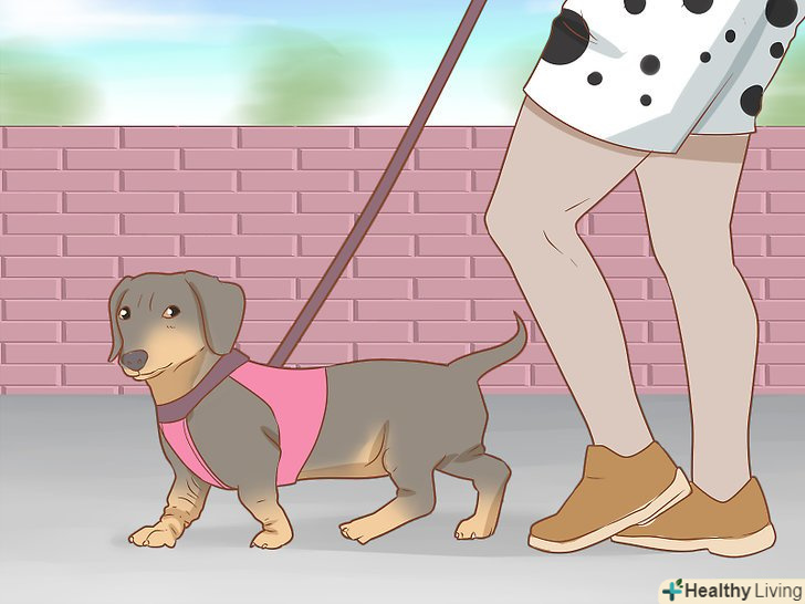 Для прогулянок з таксою надягайте на неї шлею. якщо такса схильна тягнути вас на повідку, то при використанні нашийника вона створює собі додаткове навантаження на хребет, що може привести до дископатії. Використання разом з повідцем шлейки, а не нашийника, дозволить знизити навантаження на шию і виключити ще один фактор, що викликає дископатію. [6]