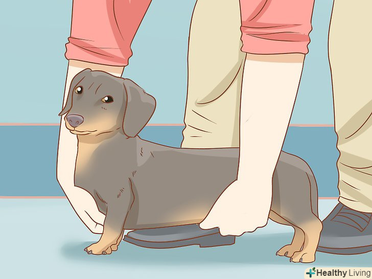 Навчіться правильно брати таксу в руки. якщо ви будете правильно брати таксу, то це допоможе захистити її спину. Щоб взяти таксу, підведіть одну руку під її попу, а іншу – під живіт, щоб підтримати спину. Можна попередньо попрактикуватися на чому-небудь легше, перш ніж намагатися взяти на руки свою таксу.- Ніколи не беріть таксу однією рукою і не піднімайте її за лапи або голову.